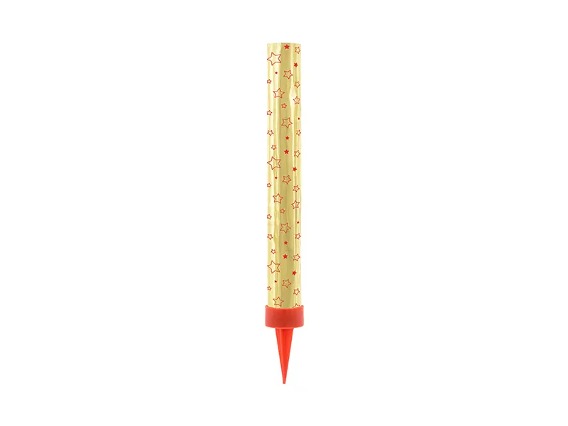 Zelta krāsas kūkas strūklaka ar sarkanu zvaigžņu rakstu. Augstums - 12 cm. Svece izšauj dzirksteles ~35 cm augstumā. Lietošanai iekštelpās. Drošais attālums: 1-1,5m.